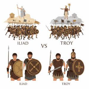 Troy filmi, Homeros'un İlyada destanından ilham alan ancak ondan önemli ölçüde farklılık gösteren bir yapımdır. Film, destanın temel olay örgüsünü almasına rağmen, anlatı yapısı, karakter tasvirleri, Tanrıların rolü ve kültürel/tarihsel detaylar açısından modern izleyiciye hitap etmek için çeşitli değişiklikler yapmıştır. Görsel tasarımda da farklı dönemlere ait unsurlar bir araya getirilmiştir. Bu durum, filmin destanın sadık bir adaptasyonu olmaktan çok, antik bir hikayenin modern bir yorumu olduğunu göstermektedir. Film, savaşın kaosu ve kahramanların birebir çatışmaları gibi bazı yönleri başarıyla yansıtmış olsa da, Antik Yunan kültürü ve inancına dair birçok noktada anakronik bir temsil sunmaktadır.