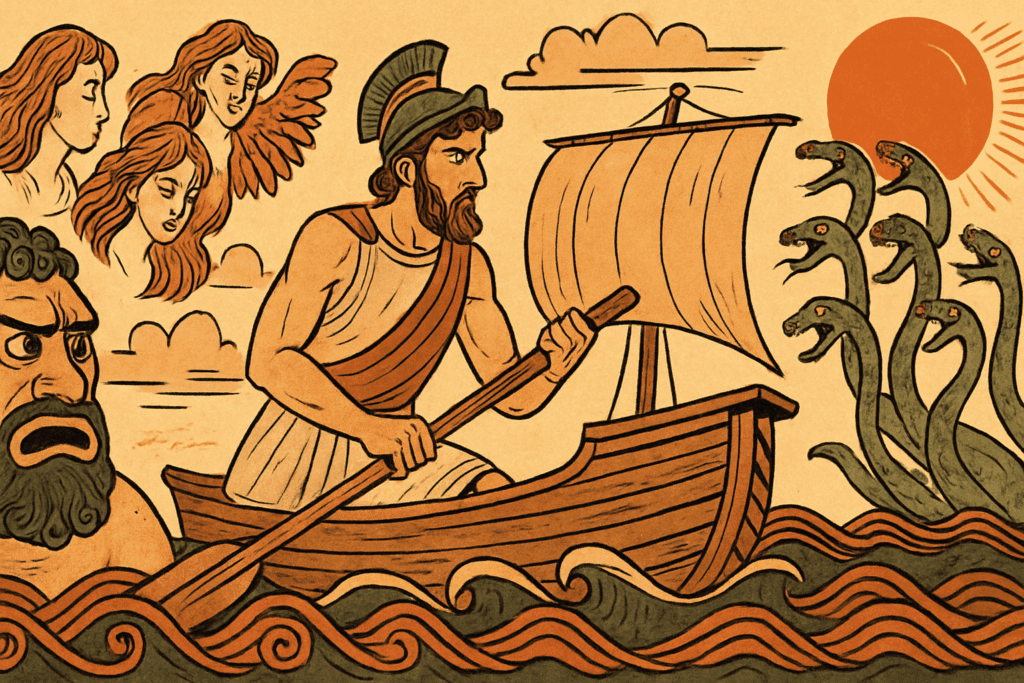 • Troya'dan İthaka'ya Uzanan Rota: Odysseus'un eve dönüş yolculuğu coğrafi olarak mantıklı bir rota izlemese de, anlatı için sembolik bir kurgu oluşturur. Başlıca duraklar arasında Kikones, Lotus Yiyiciler, Polyphemos (Kyklops), Aiolos Adası, Laistrygonlar, Kirke (Aiaia), Hades (Ölüler diyarı), Sirenler, Skylla & Kharybdis, Helios'un Adası, Kalypso'nun Adası ve Phaiaklar yer alır. Her durak, tematik bir sınav sahnesidir.